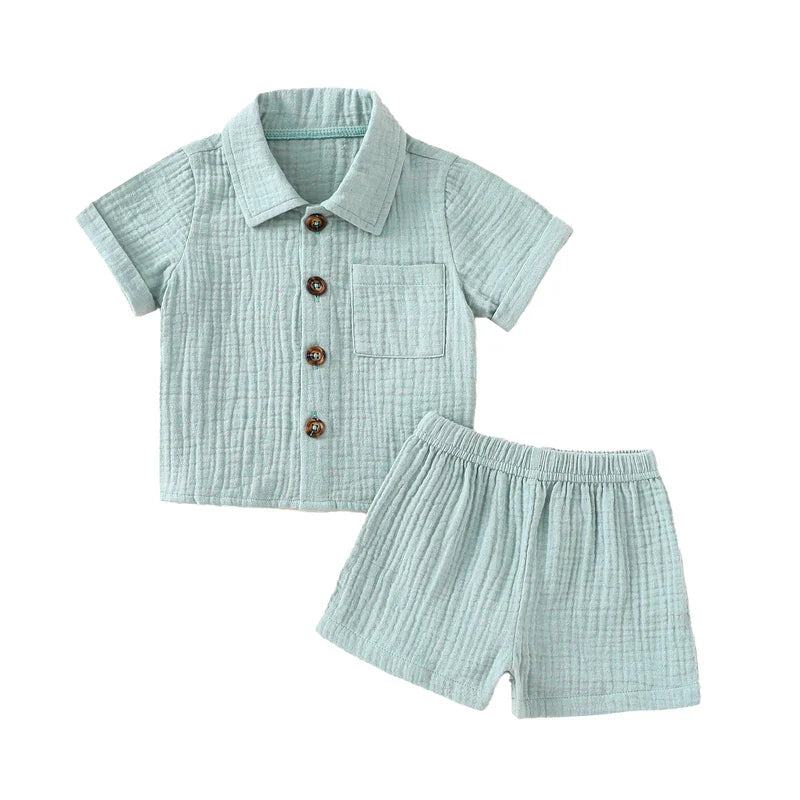 Solid short sleeve pocket button down lapel shirt and shorts set for babies in white, blue, and beige. Soft breathable fabric ideal for toddlers.
